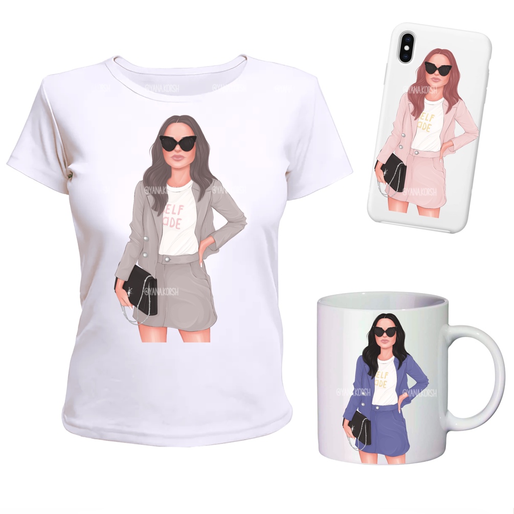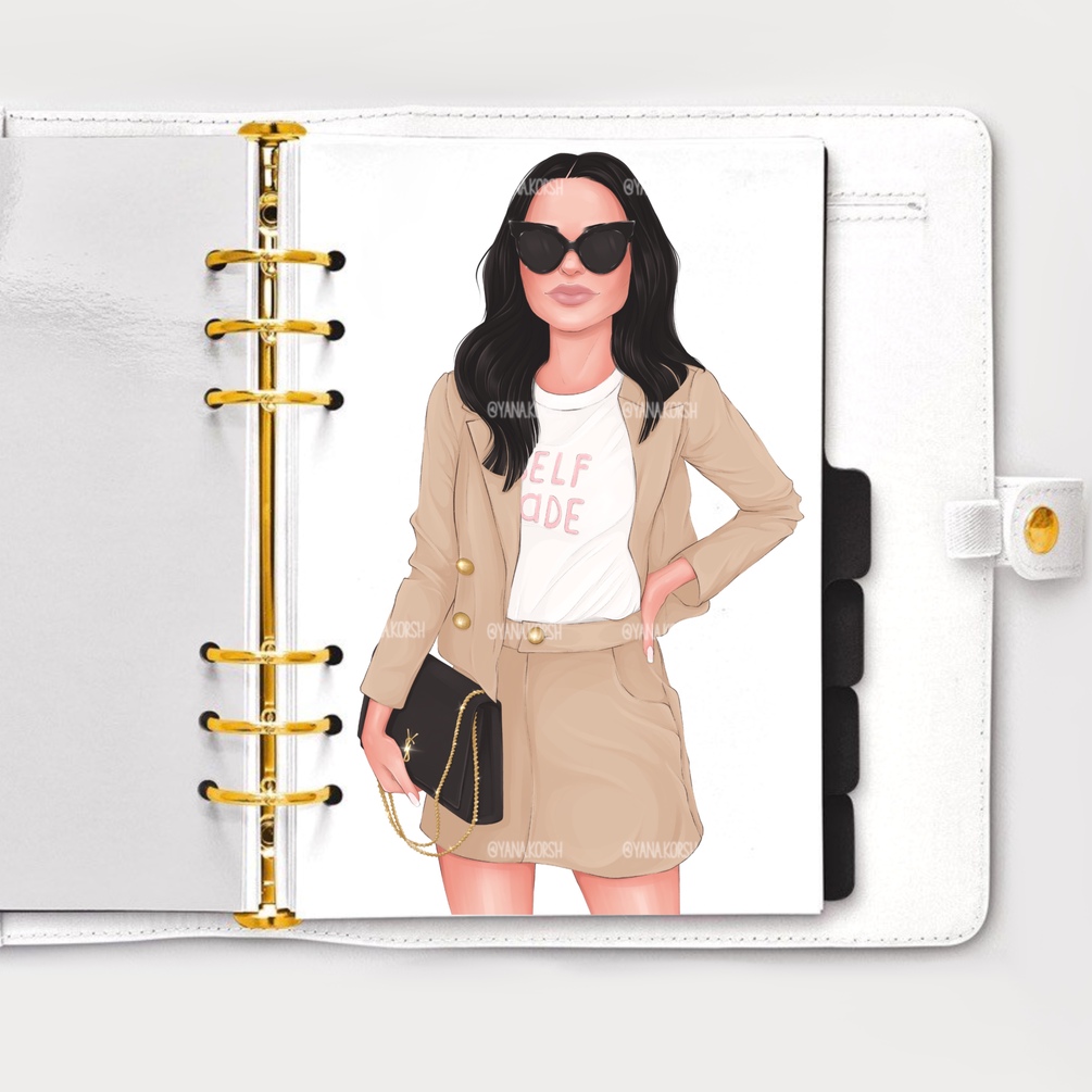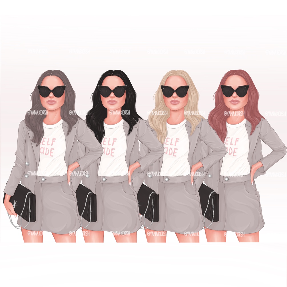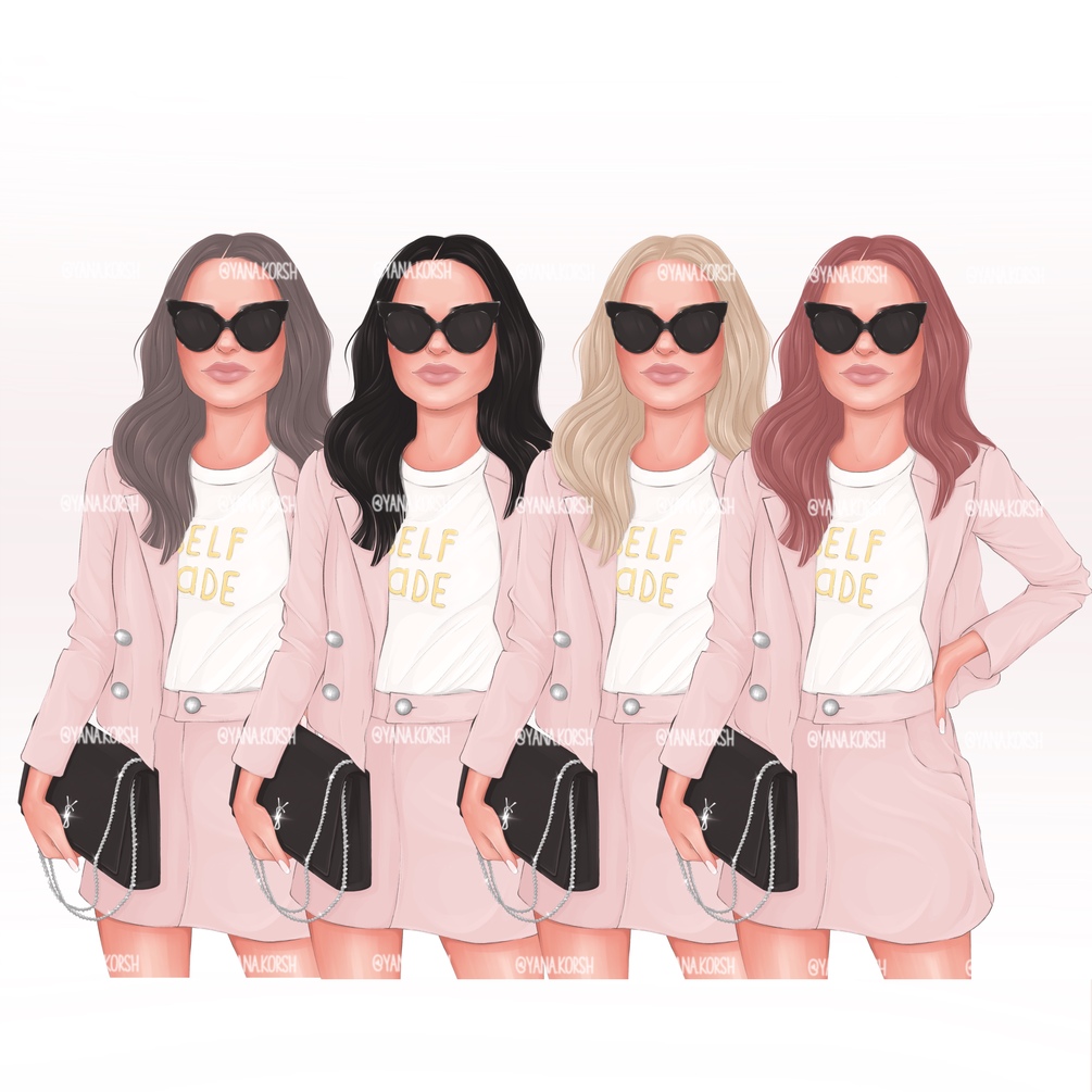 Girly clip art of a fashion boss girl in a suit, sunglasses and with a bag. 5 color variations of clothes and 4 shades of hair. 20 hand-drawn png files, 15x13 inches, 300 dpi.