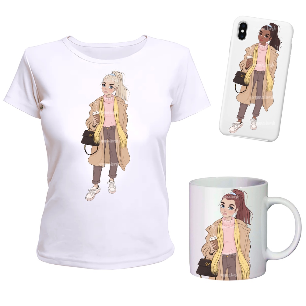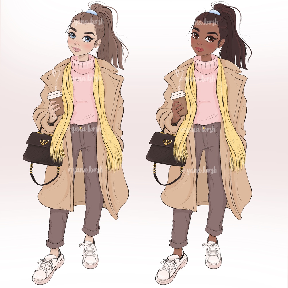 Fashion clipart of a young cartoon boss girl with coffee in her hand. 2 skin tones. 8 png files 300 dpi.