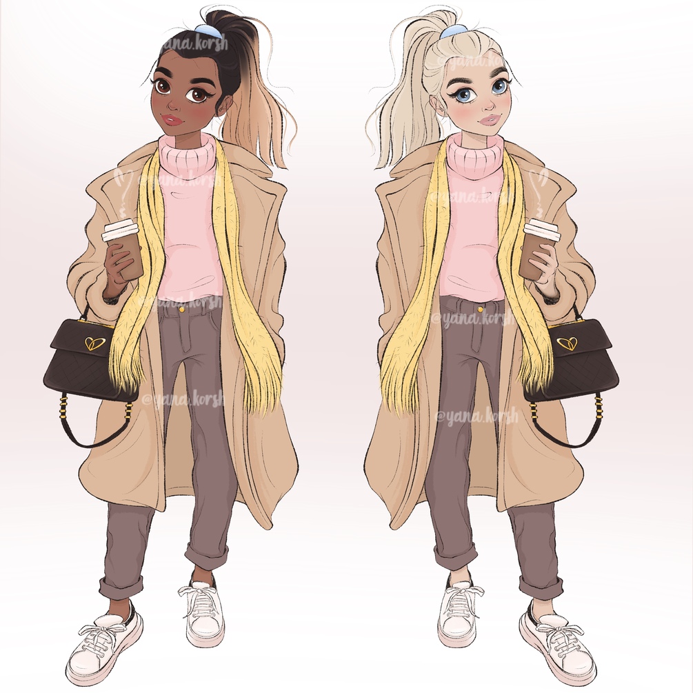 8 hand-drawn png illustrations on a transparent background of 15*15 inches, 300 dpi. 2 skin tones, 4 shades of hair: brown, black, blonde, reddish.