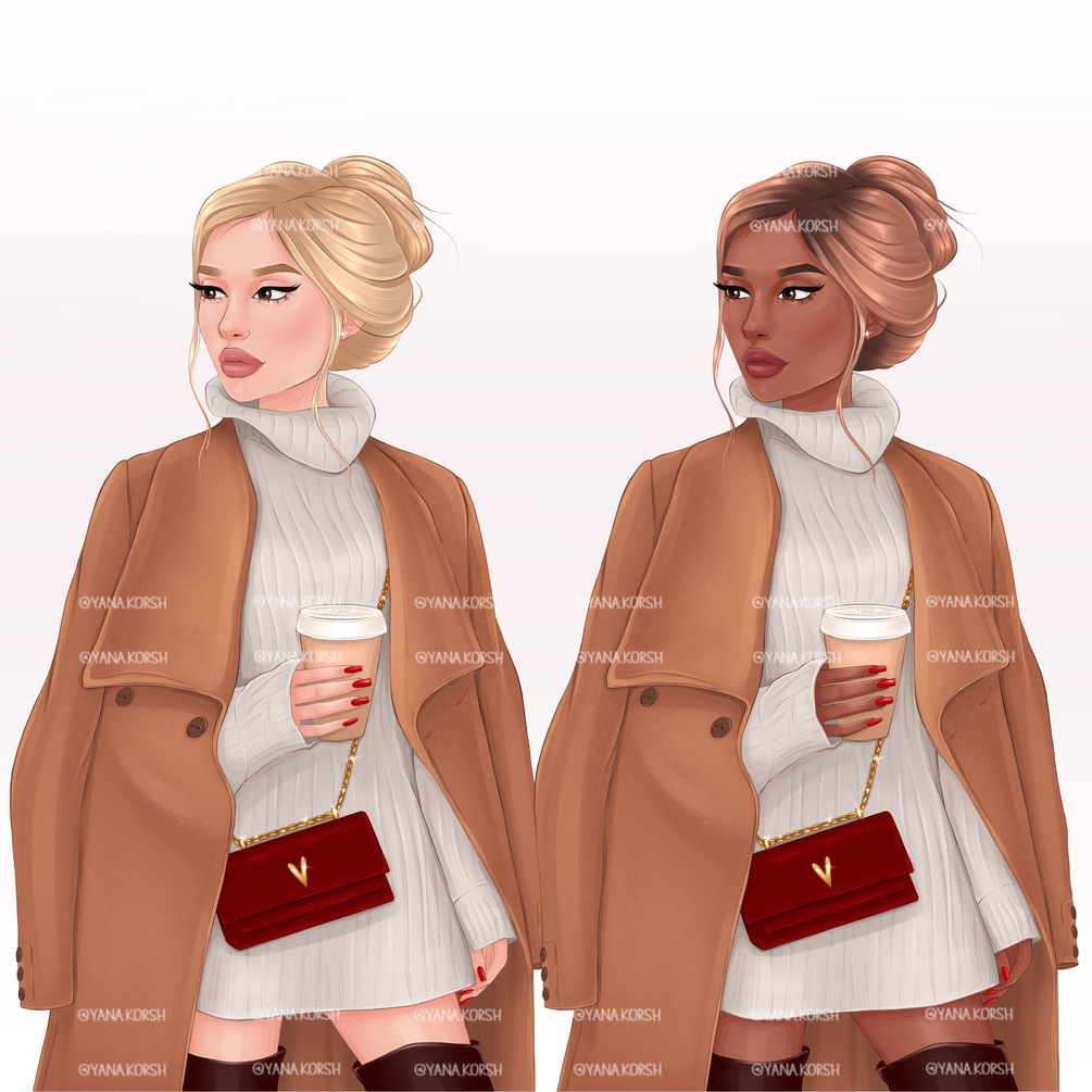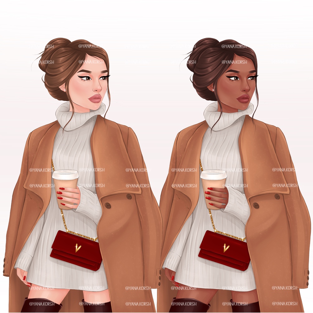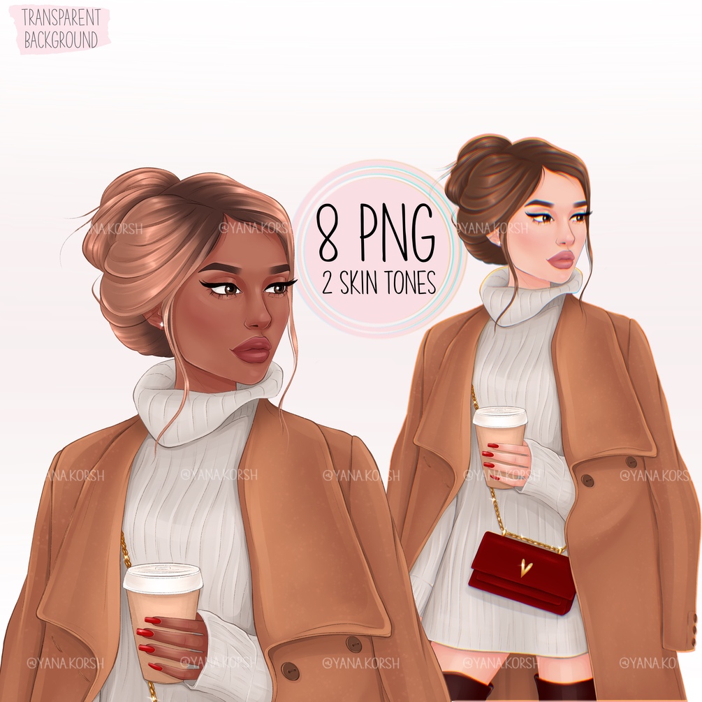 Fashion clip art of the boss girl with coffee. 2 skin tones, 4 hair colors. 8 png files, 300 dpi on a transparent background, 14*14 inches.