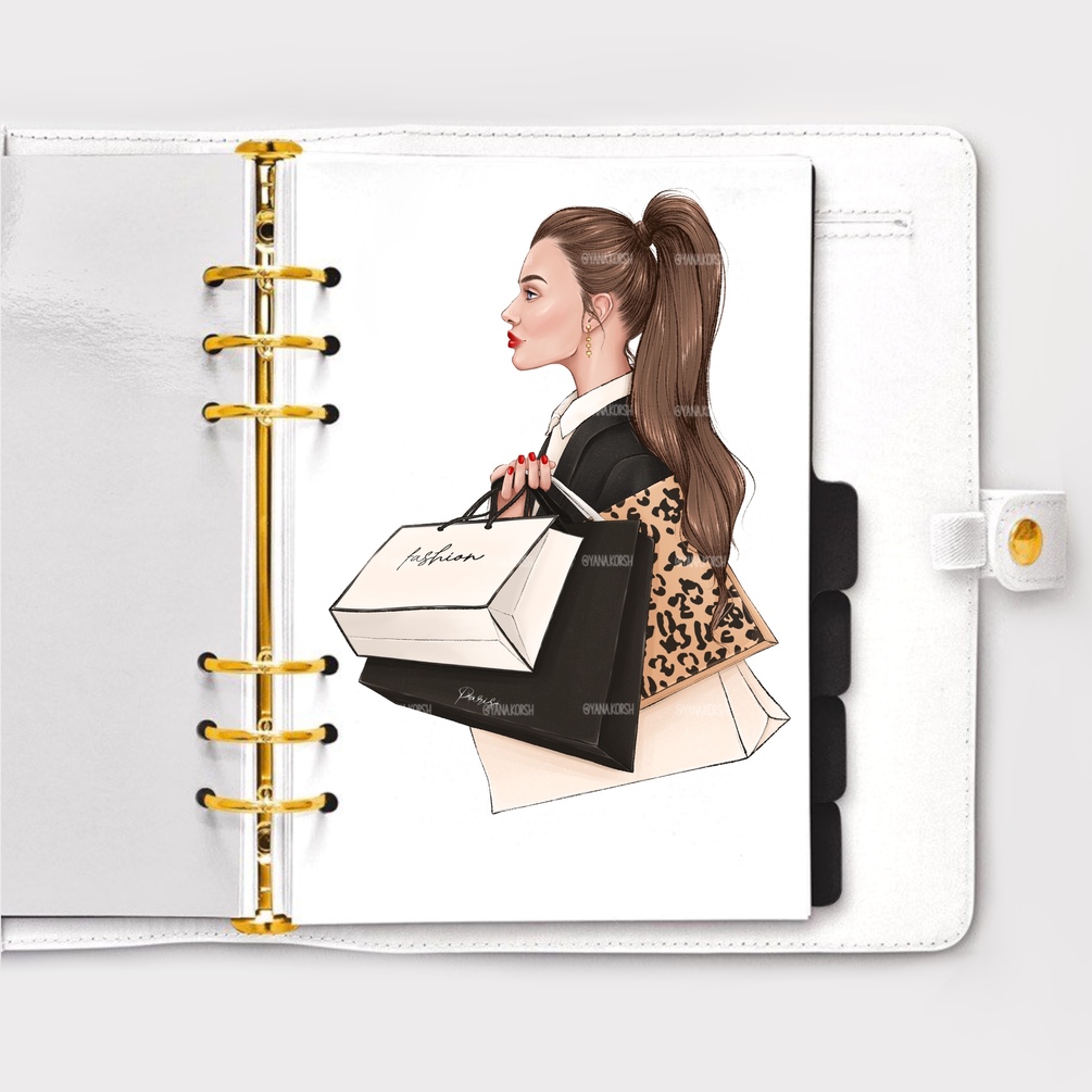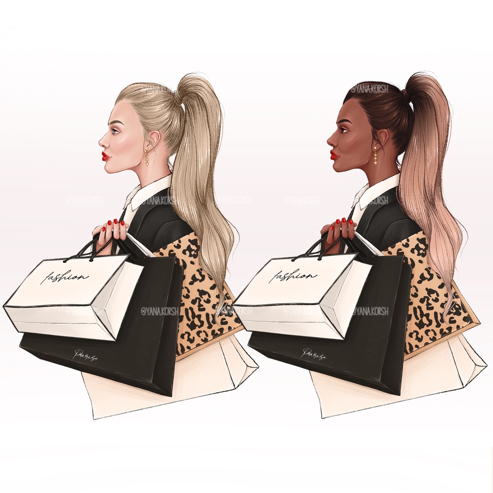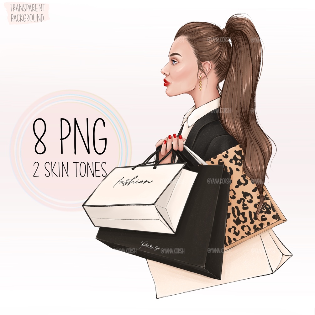 Girly clip art of a fashion girl with shopping. 2 skin tones, 4 shades of hair. 8 manually drawn png files, 13x15 inches, 300 dpi.